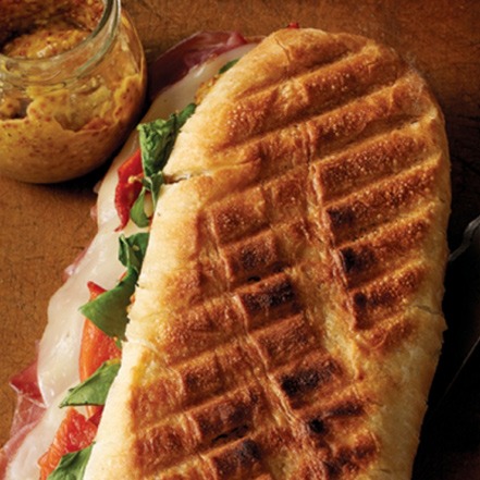 2. Schneiden Sie die Sandwich-Brötchen längs in zwei Hälften auf. Geben Sie nun auf jede der aufgeschnittenen Hälften den grobkörnigen Senf und verteilen Sie den Prosciutto in kleinen Stücken auf den unteren Brötchenhälften. Zerteilen Sie dann jede Scheibe der Provolone noch einmal und legen sie auf den Schinken. Als Topping kommen jetzt noch die Basilikumblätter und die grillierten Peperoni-Stücke dazu. Die Sandwich-Brötchenhälften wieder aufeinander legen, fest zusammendrücken und anschliessend leicht mit Öl bestreichen.
